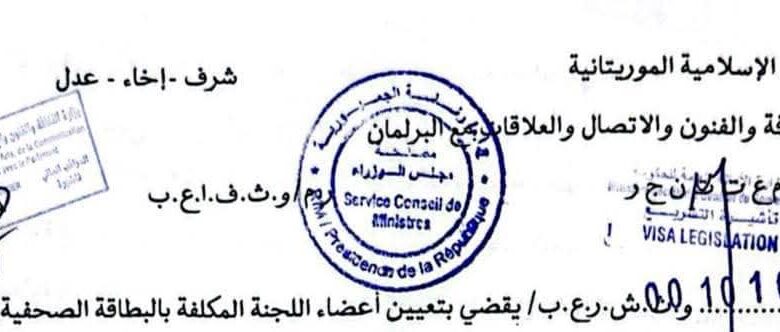 أصدر معالي وزير الثقافة والفنون والاتصال والعلاقات مع البرلمان، الناطق باسم الحكومة الحسين ولد مدو، مقررًا يقضي بتعيين اللجنة المكلفة بالبطاقة الصحفية، في إطار تطبيق أحكام قانون الصحفي المهني.