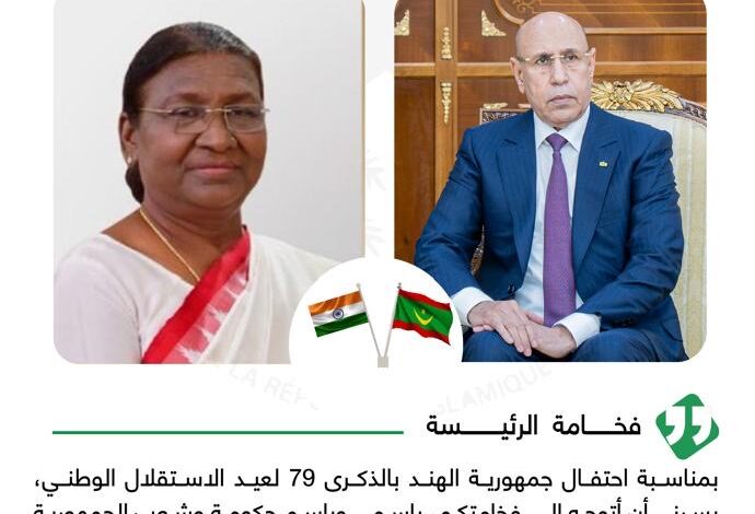 بمناسبة احتفال جمهورية الهند بالذكرى 79 لعيد الاستقلال الوطني، يسرني أن أتوجه إلى فخامتكم، باسمي وباسم حكومة وشعب الجمهورية الإسلامية الموريتانية، بأحر التهاني وأصدق التمنيات، راجيًا لكم موفور الصحة والسعادة، وللشعب الهندي الصديق المزيد من التقدم والازدهار.