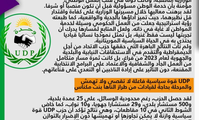 لقد حصل الحزب، رغم محدودية الوسائل، على 25 عمدة بلدية. و500 مستشار بلدي، و29 مستشارا جهويا، و 10 نوإب، كما خاض الشوط الثاني في 10 مقاطعات وهي نتائج تؤكد أن حزب UDP قوة سياسية وازنة لا يمكن تجاوزها أو تهميشها دون الإضرار بالتوازن الديمقراطي، بل تشكل ركيزة أساسية ضمن التحالف الداعم لفخامة رئيس الجمهورية السيد محمد ولد الشيخ الغزواني.