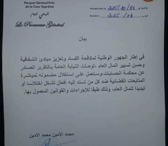 في إطار الجهود الوطنية لمكافحة الفساد وتعزيز مبادئ الشفافية وحسن تسيير المال العام ،توصلت النيابة العامة بالتقرير الصادر عن محكمة الحسابات، وستعمل على استغلال مضمونه لمباشرة المتابعات القضائية ضد كل من تسند إليه أفعال تشكل اختلاسا أو تبديدا للمال العام، وذلك طبقا للإجراءات والقوانين المعمول بها.