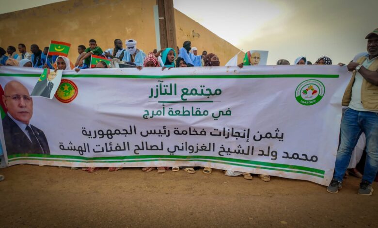 استقبل مجتمع “التآزر” في مدينة آمرج، مساء اليوم، فخامة رئيس الجمهورية السيد محمد ولد الشيخ الغزواني عند مدخل المدينة، في مشهد يجسد مشاعر الامتنان والعرفان للسياسات الحكيمة التي ينتهجها فخامته في دعم الفئات الهشة وتحسين ظروفها المعيشية. وقد عبر المستفيدون من برامج المندوبية العامة للتضامن الوطني ومكافحة الإقصاء “التآزر” عن تقديرهم لما تحقق من إنجازات ملموسة شملت التأمين الصحي، والمساعدات النقدية، والتمويلات الأنشطة المدرة للدخل، إلى جانب مشاريع البنية التحتية في مجالات التعليم والصحة والمياه، مؤكدين أن هذه الجهود عززت ثقتهم في النهج التنموي القائم على العدالة والتكافل الذي يقوده فخامة الرئيس في مختلف مناطق الوطن.