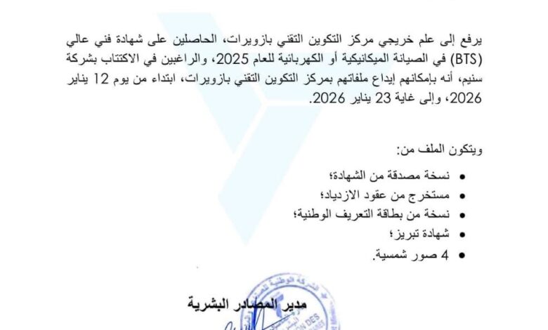 ودعت الشركة الراغبين في الترشح إلى إيداع ملفاتهم لدى مركز التكوين التقني بازويرات ابتداءً من يوم 12 يناير 2026، على أن يستمر استقبال الملفات إلى غاية 23 يناير 2026.