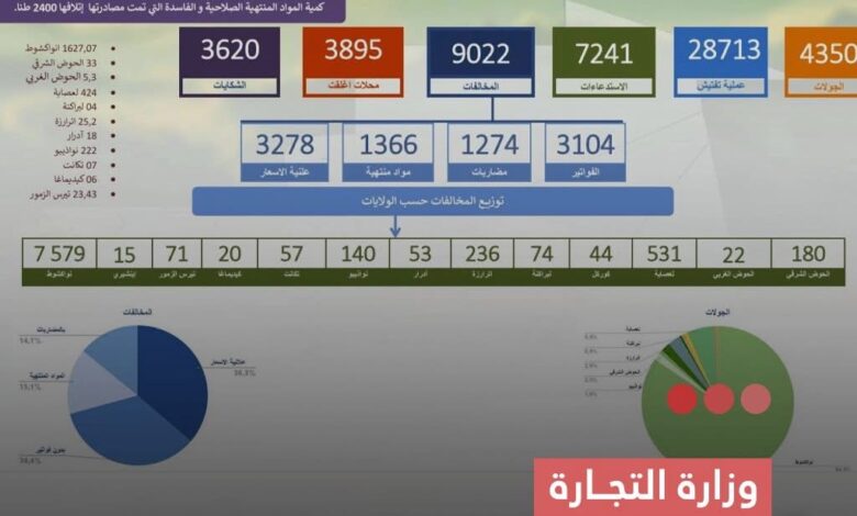 كما أعلنت الوزارةأنها أغلقت 3895 محلا تجاريا أعيد فتحها بعد تسديد الغرامات، وأحالت 32 مخالفا إلى العدالة، فضلا عن مصادرة وإتلاف 2400 طن من المواد الفاسدة والمنتهية الصلاحية، في إطار جهود حماية صحة المستهلك وتنظيم الأسواق.