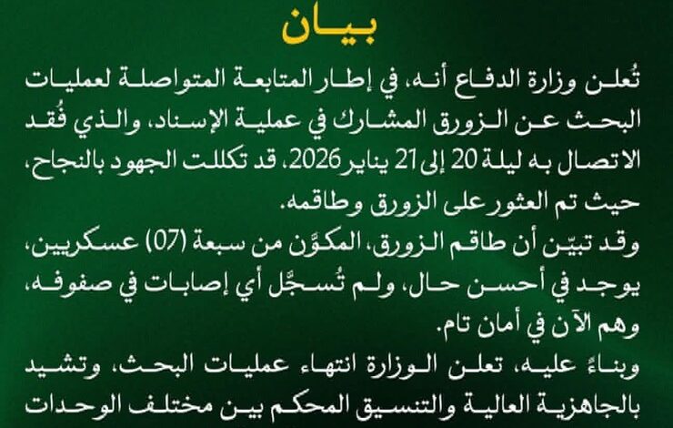 أعلن الجيش الوطني , عبر منشور على صفحته بالفيسبوك , نجاح عمليات البحث عن الزورق العسكري الذي فُقد الاتصال به خلال مشاركته في عملية إسناد بحرية، مؤكدة العثور عليه وعلى طاقمه المكوَّن من سبعة عسكريين، وهم جميعًا في صحة جيدة ولم تُسجل في صفوفهم أي إصابات.