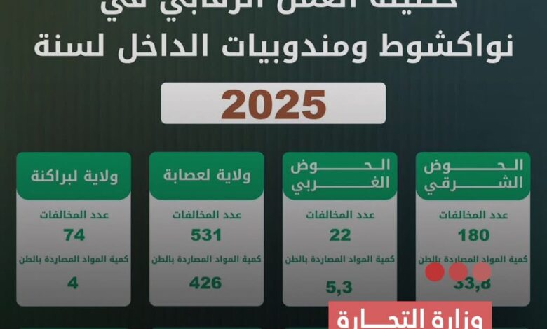 أعلنت وزارة التجارة والسياحة تسجيل عدد كبير من المخالفات التجارية في ولايات نواكشوط ومختلف ولايات الداخل، مع مصادرة كميات معتبرة من المواد المخالفة للمعايير المعتمدة.