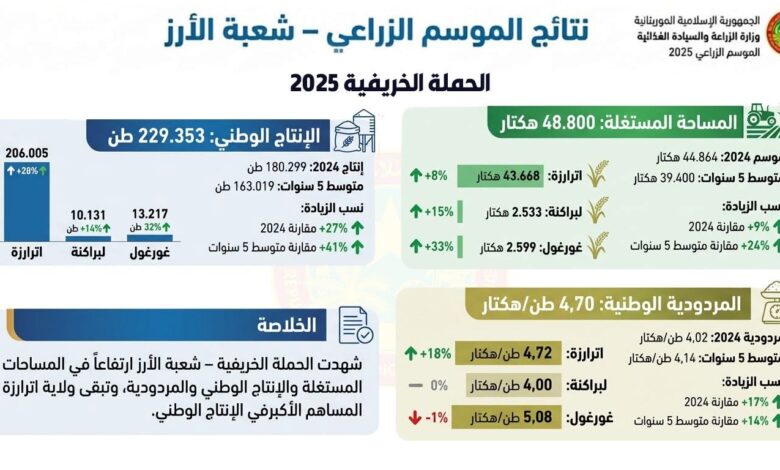 صادقت وزارة الزراعة والسيادة الغذائية، مساء أمس، على الإحصائيات النهائية للموسم الزراعي لشعبة الأرز لسنة 2025، وذلك بإشراف وزير الزراعة والسيادة الغذائية، سيد أحمد ولد ابوه، وبحضور الطاقم الفني المختص بالوزارة.