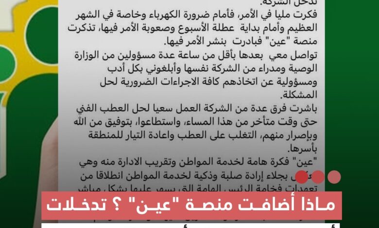 لا شك أن “عين” أداة عمل غير مسبوق وذات نتيجة مباشرة وفورية يجد المواطن فيها سبيله نحو إعادة الثقة في المرافق الحكومية والإدارية.