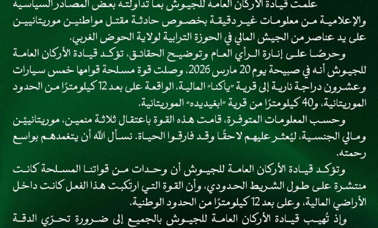 أصدرت الأركان العامة للجيوش بياناً توضيحياً بشأن حادثة مقتل مواطنين موريتانيين قرب الحدود مع مالي، مؤكدة أن الواقعة جرت داخل الأراضي المالية.